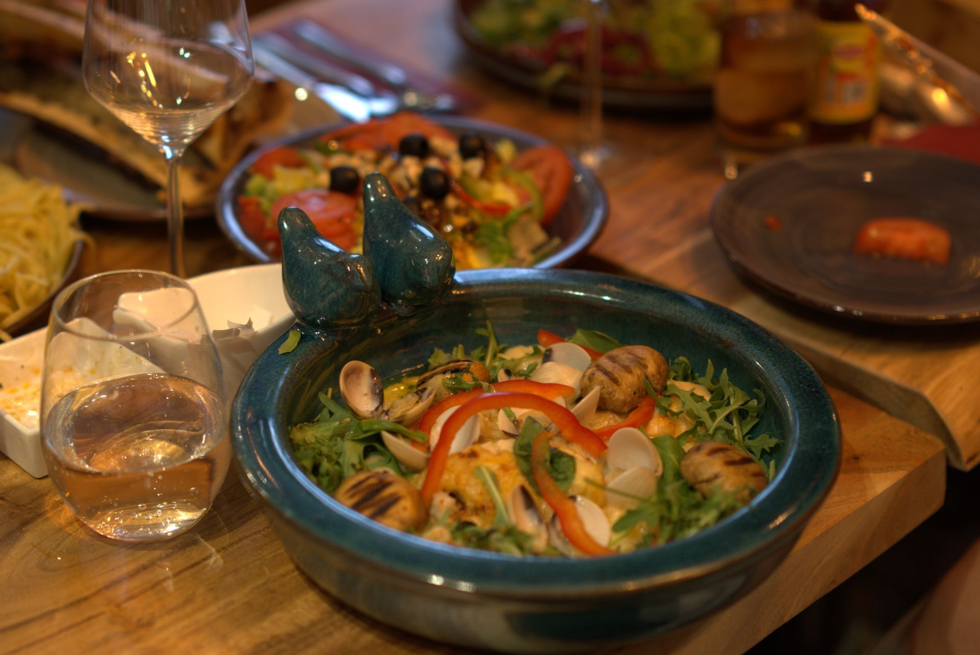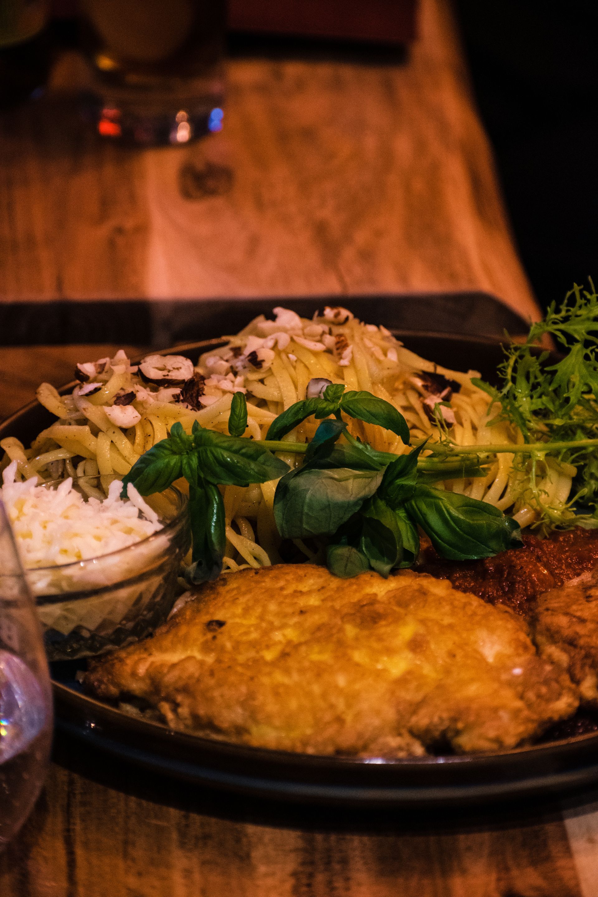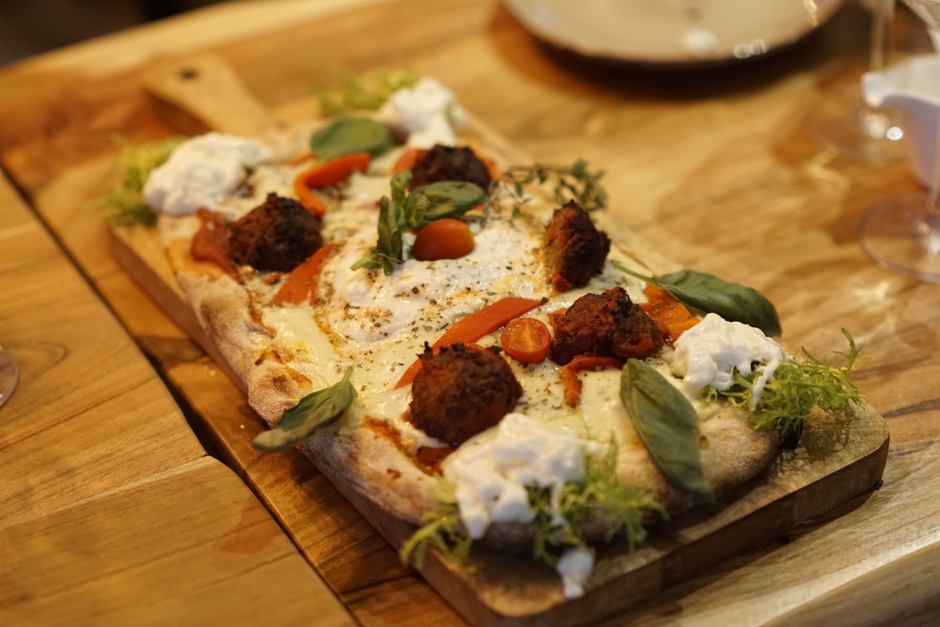Gehaktballetjes, tomatensaus, gegrilde paprika, roclette kaas, zwarte peper