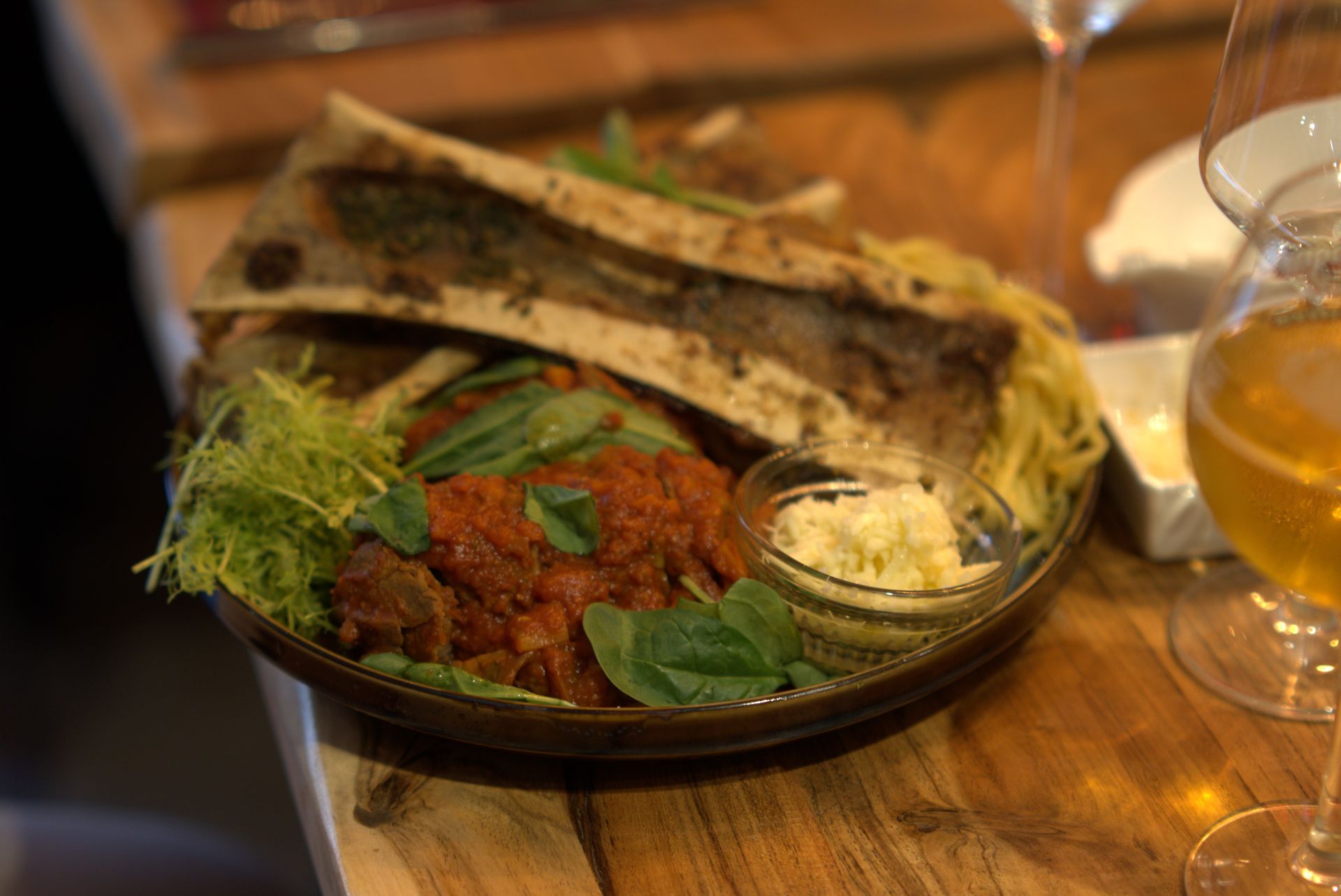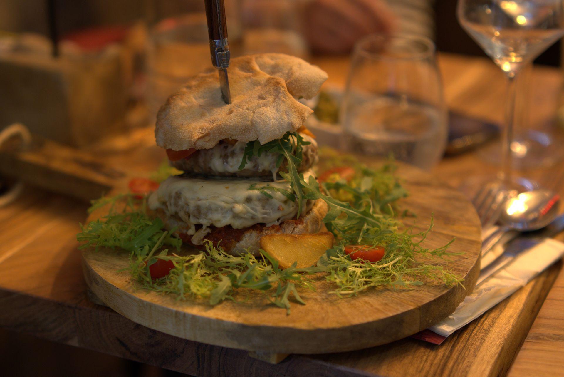 Buffelmozzerela, uienringen in bierbeslag, pepersaus, rucola, gehakte kerstomaatjes